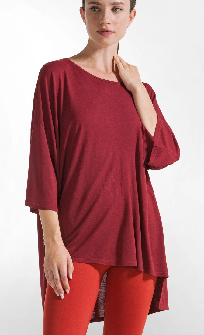 Heeft een langer vallende achterkant en 3/4 mouwen.