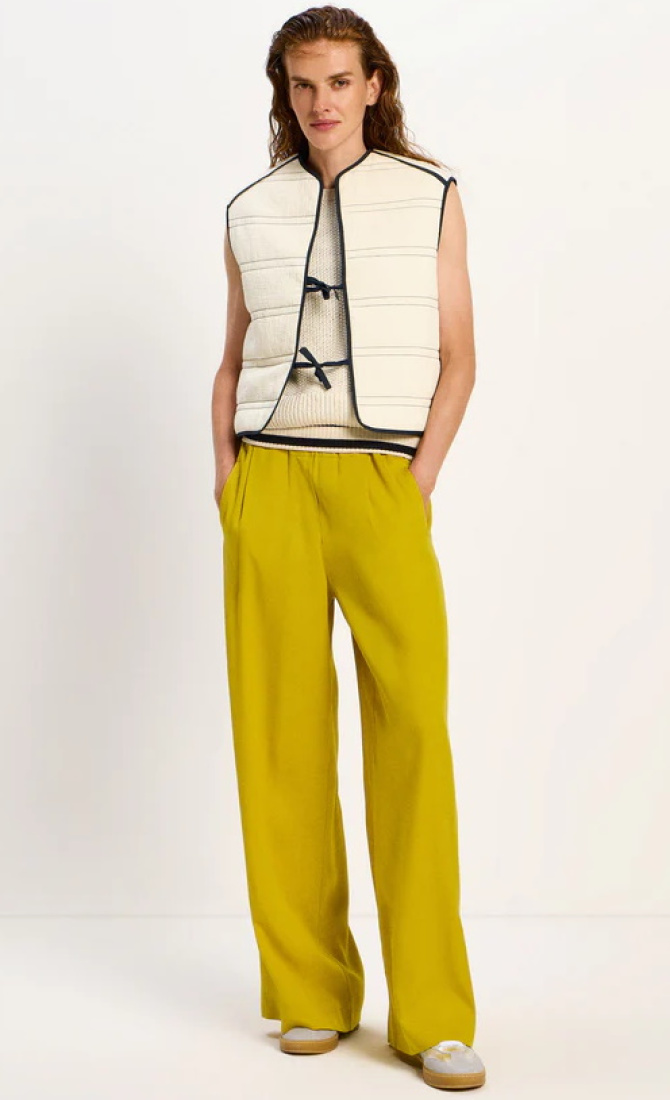 De brede elastische tailleband zorgt voor een flexibele en comfortabele pasvorm, terwijl plooien en de lange, rechte snit een stijlvoll silhoutte creëren.