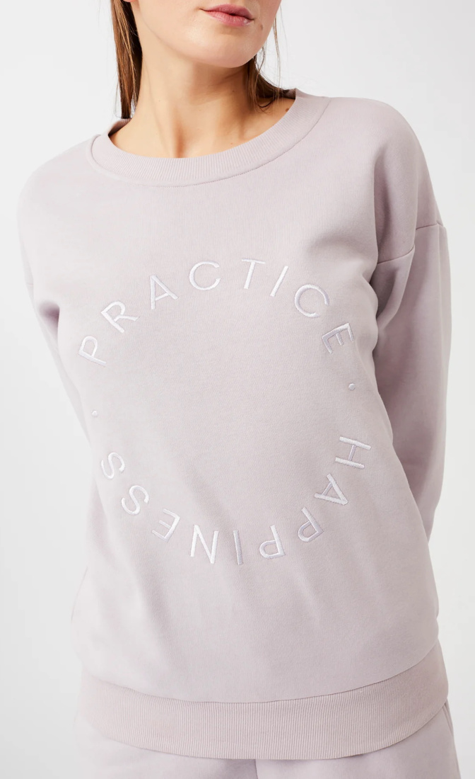Heeft "'Practice Happiness" ton-sur-ton borduring op de voorzijde.