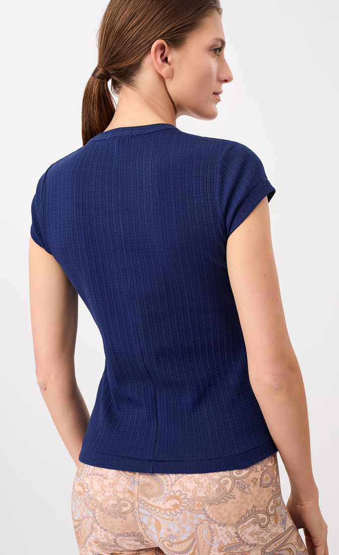 Soft T-shirt with short sleeves, classic round neckline in special pique fabric. The shirt is cut close to the body and has a length to the hips at a height of 1.70m.