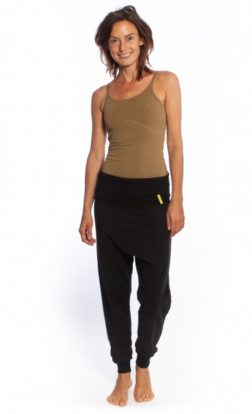 These organic cotton pants have a very wide fold down waist and a casual asymmetrical design.