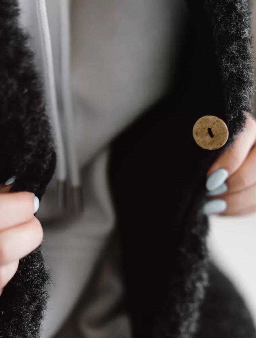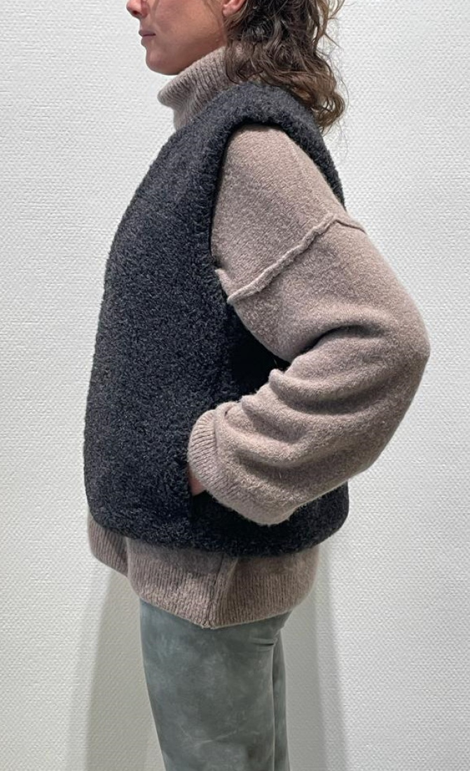 Heeft zijzakken en een onzichtbare sluiting met (houten) knoopje in het midden aan de binnenkant.